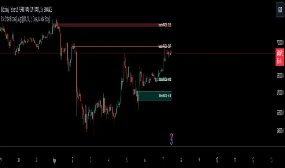 The "RSI Order Blocks [UAlgo]" identifies and visualizes potential order blocks based on the Relative Strength Index (RSI) indicator. These zones may indicating potential support or resistance levels.