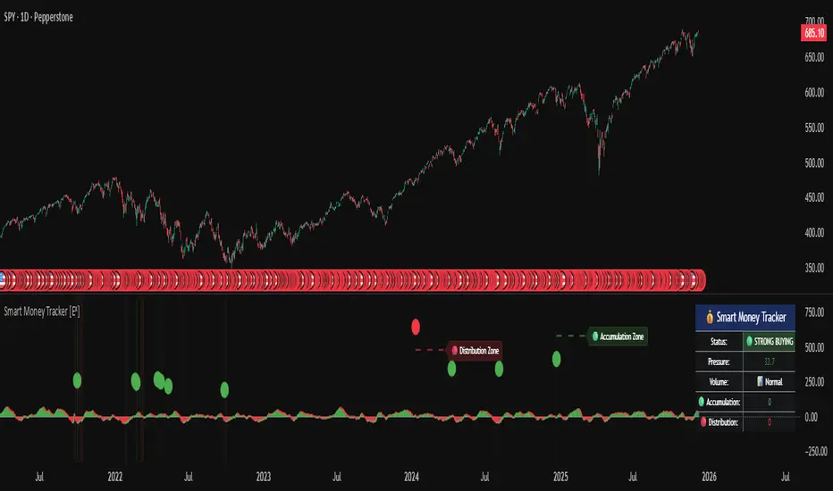 The Smart Money Tracker helps you identify when institutional traders (banks, hedge funds, and large players) are actively buying or selling. By analyzing unusual volume patterns and price action, this indicator reveals hidden accumulation and distribution zones that often precede major price moves.