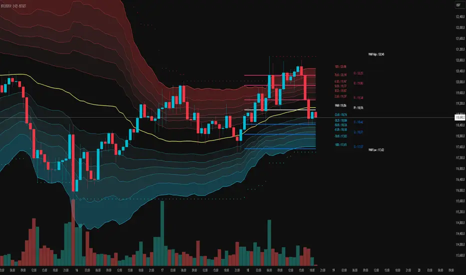 • **Fibonacci Integration**: Fibonacci levels (23.6%, 38.2%, 50%, 61.8%, 78.6%) extended around VWAP center