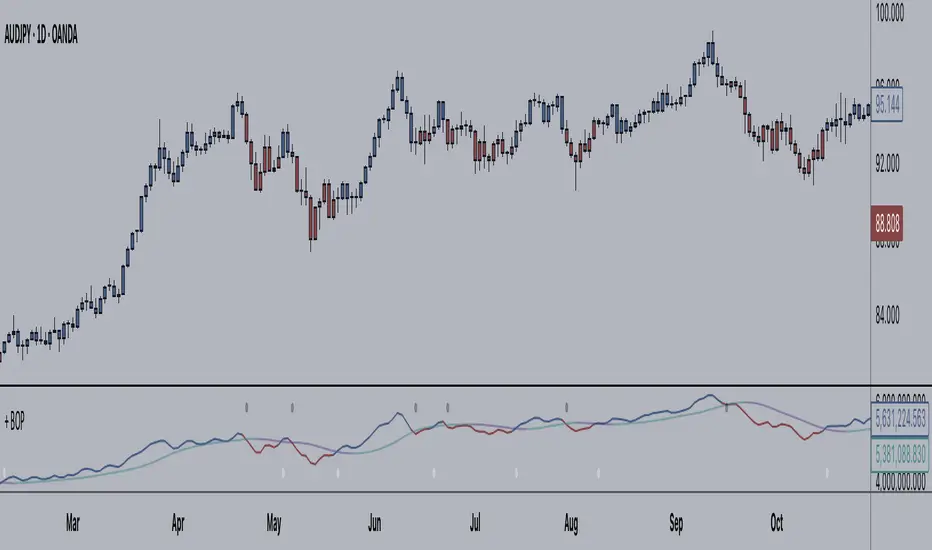 In my version of this indicator I provide a pretty broad selection of moving averages with which one may choose to smooth out the BOP, as well as an EMA provided to use as a sort of signal line for trade entries and/or exits, taking partial profits, scaling into a position, etc.