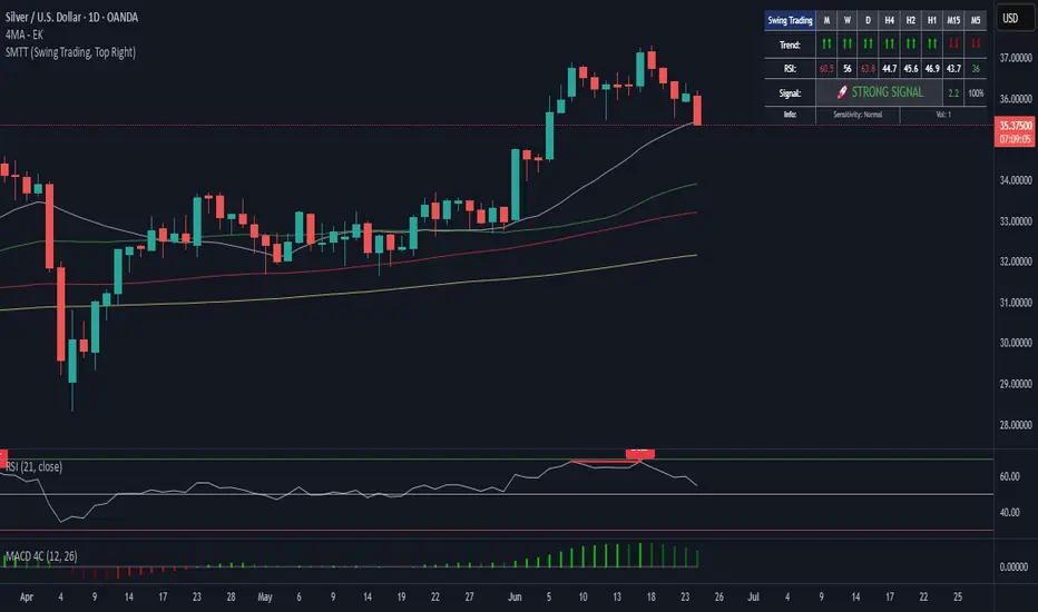 It moves beyond simple moving average crossovers by calculating a sophisticated Trend Score for each timeframe. This score is then intelligently combined into a single, weighted Confluence Signal, which adapts to your personal trading style. With integrated RSI and divergence detection, SMTT provides a powerful, all-in-one tool to confirm your trade ideas and stay on the right side of the market.