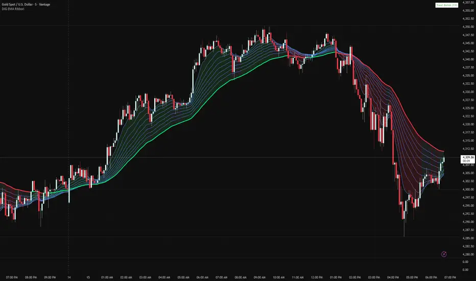 The indicator analyzes the slope direction of all 9 EMAs. When 7 or more EMAs agree on direction, the ribbon displays a clear bullish or bearish color. This consensus-based approach helps filter out weak or conflicting trends, keeping you focused on high-probability setups.