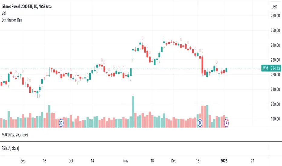 Marks D above candle or F below the candle based on IBD definition of distribution day and follow-through day.Distribution day: The loss must be at least -0.2%; the volume is higher than prior trading day.