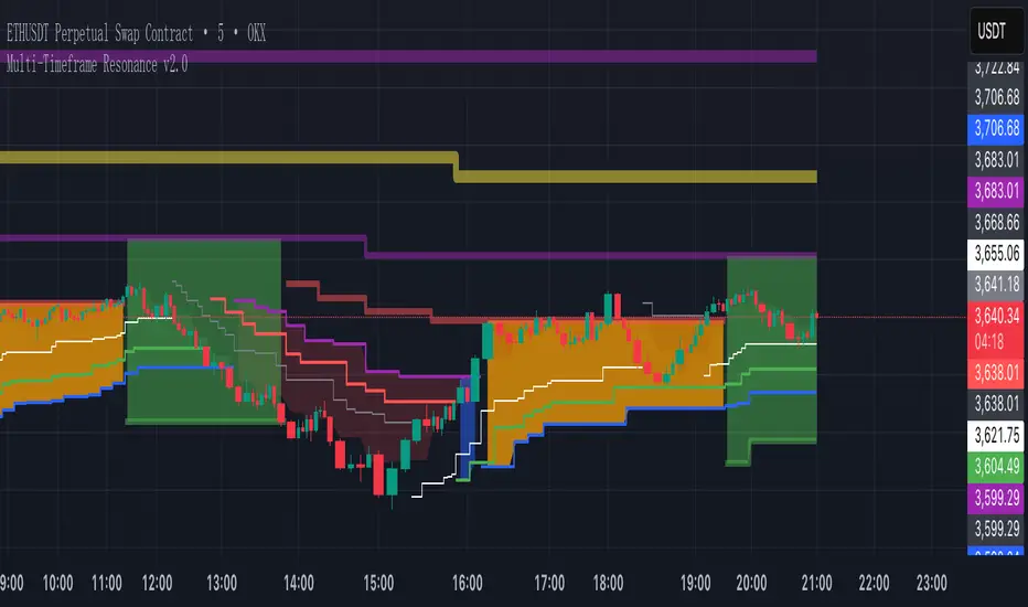 🔹 Multi-timeframe resonance analysis: Detects trend direction and range across timeframes. Helps identify M tops, W bottoms, consolidation turning points, and trend switches.