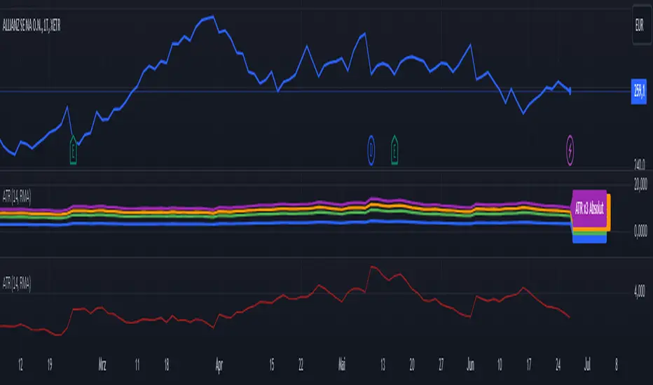 Dieses Skript basiert auf dem ATR-Indikator und wurde so angepasst, dass sowohl relative (%) als auch absolute Zahlen angezeigt werden. Es bietet eine Darstellung des ATR in absoluten und prozentualen Werten sowie multipliziert mit den Faktoren x2, x2.5 und x3. Diese Darstellung erleichtert die Festlegung von Stop-Kursen, insbesondere für Trailing Stops und Trailing Abstände.