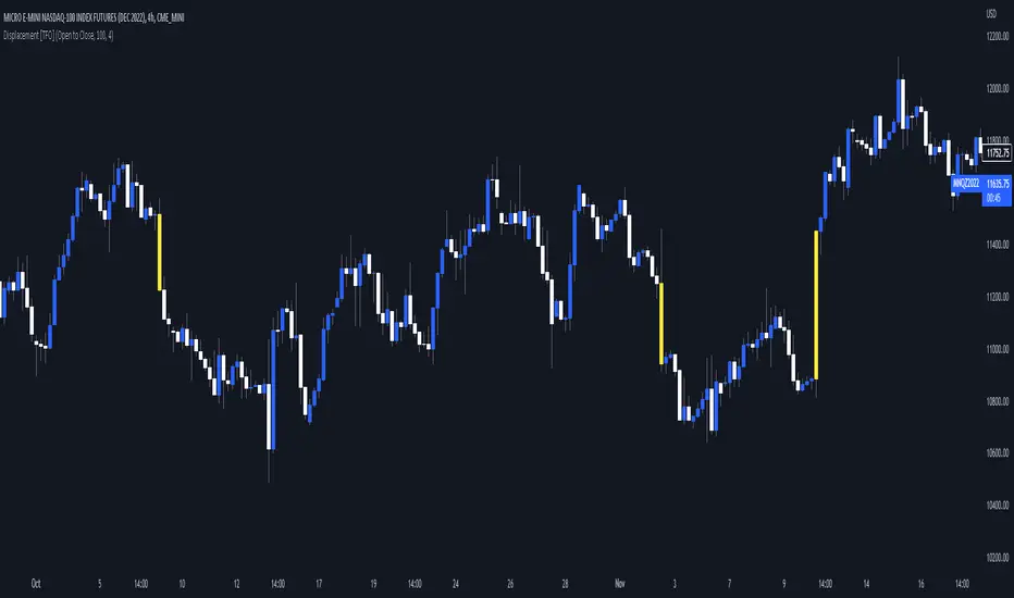Displacement is a key concept in Inner Circle Trader (ICT) concepts, especially when anticipating potential changes in trend. Although it's fairly easy to see "displacement candles" with large ranges, the bar coloring in this script can help remind us of who is in control (buyers or sellers) based on what side is creating those energetic moves most recently. Once we see signs of displacement, we can then apply concepts like premium/discount, order blocks, optimal trade entries, etc. to look for reasonable trade opportunities in the direction of the current trend.