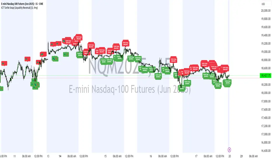 This indicator implements the ICT Turtle Soup concept — a classic liquidity-based reversal pattern — which occurs when price runs above or below a recent swing level to grab liquidity, then sharply reverses. This pattern is commonly used in Smart Money Concepts (SMC) and Inner Circle Trader (ICT) strategies to anticipate false breakouts and high-probability reversals.