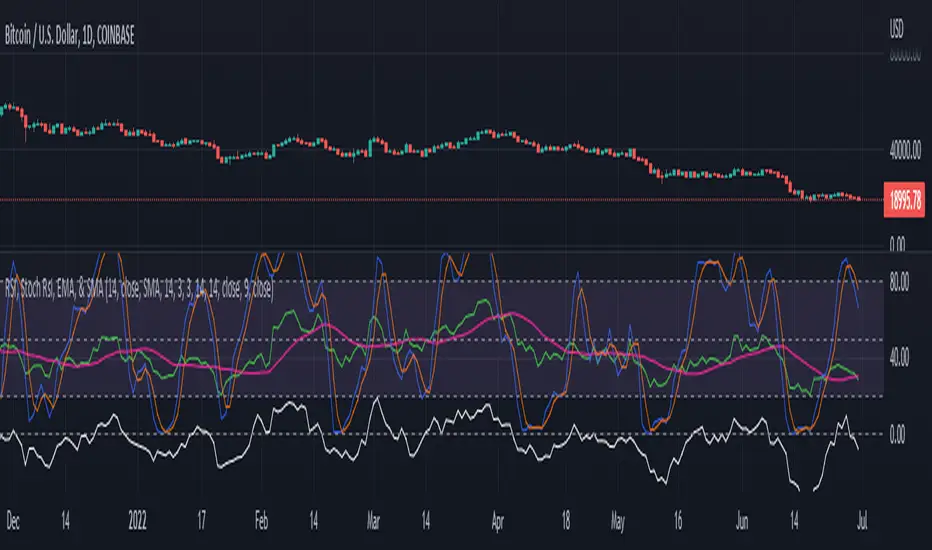 This indicator is simply an enhanced version of the RSI followed up by a few extra indicators that pair strongly with the RSI. This indicator allows the user to interact with various inputs based off the indicators provided. All indicators include moving average, relative strength index, stochastic relative strength index, simple moving average, exponential moving average, and rate of change. This program is unique as it is very versatile allowing the user to use as little or as many indicators as needed interchangeably.
