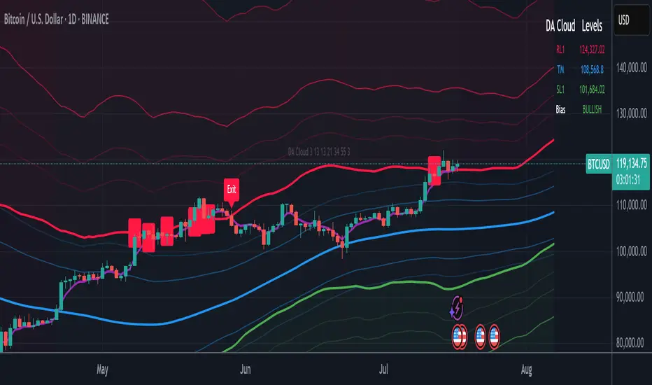 The DA Cloud - Dynamic is an advanced technical analysis tool that creates adaptive support and resistance zones that expand and contract based on market volatility. Unlike traditional static indicators, this cloud system "breathes" with the market, providing dynamic levels that adjust to changing market conditions.