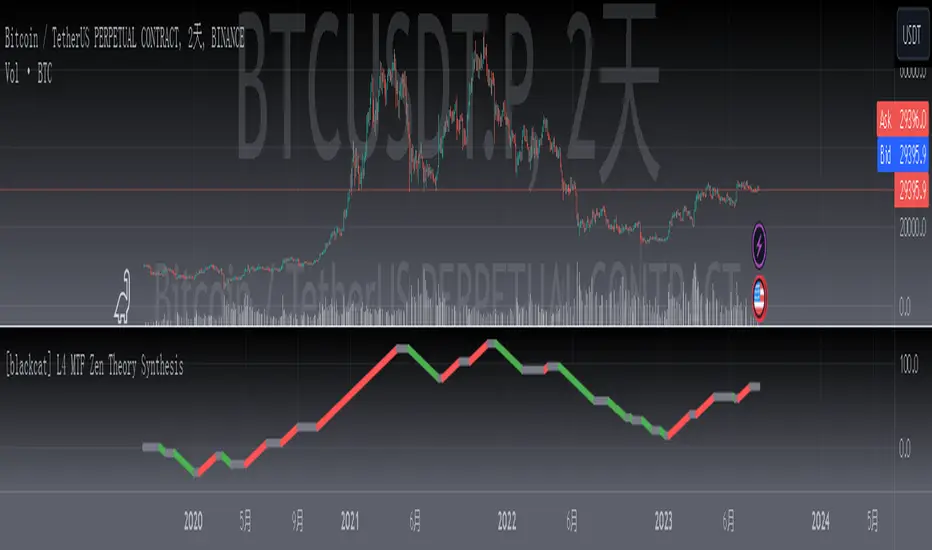 With a theoretical basis, how to reflect the state of a cycle? This is a complicated problem, but if it is to be synthesized at a low level, a small cycle, and reflect the characteristics of a large cycle, it must be simplified. Otherwise, not only my brain is not enough, the TradingView server The limited computing resources on the terminal will also forcibly stop my program. Therefore, by observing the divergence information on the 4 cycles, scoring, extracting all the scores and synthesizing them on the minimum cycle, I will get what I said today Indicator [blackcat] L4 MTF Zen Theory Synthesis. Is it very interesting? The idea is like this, but I am still a little bit confused when I code it out and show it. How to use this?