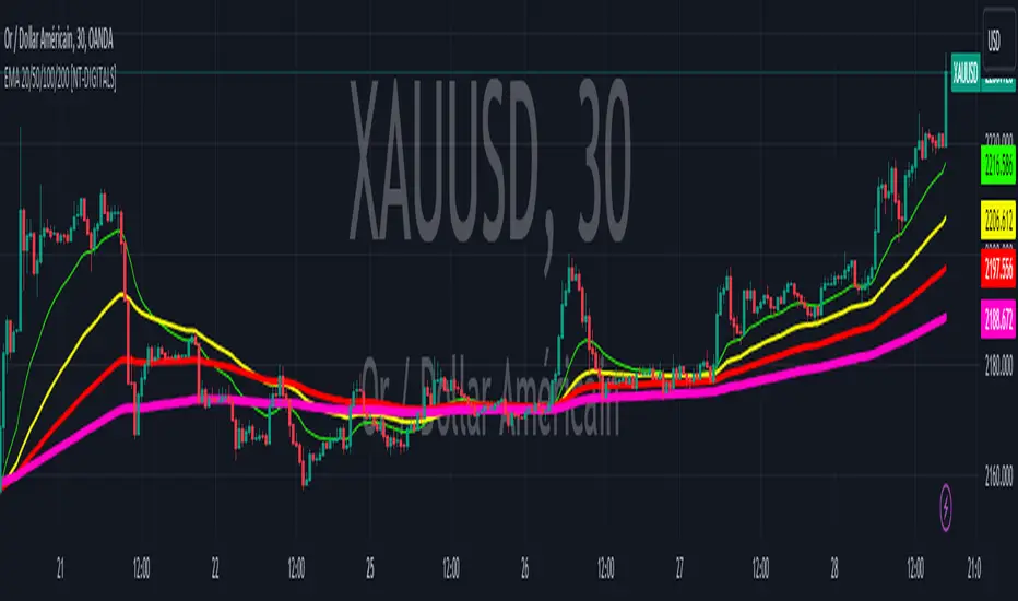 This script plots Exponential Moving Averages (EMA) of 20, 50, 100, and 200 periods on the chart. EMAs are commonly used by traders to identify trends and potential reversal points in the market. The EMA smooths out price data to create a single line that follows the overall trend more closely than a simple moving average. By plotting multiple EMAs of different periods, traders can observe the interaction between short-term and long-term trends, aiding in decision-making for entry and exit points.