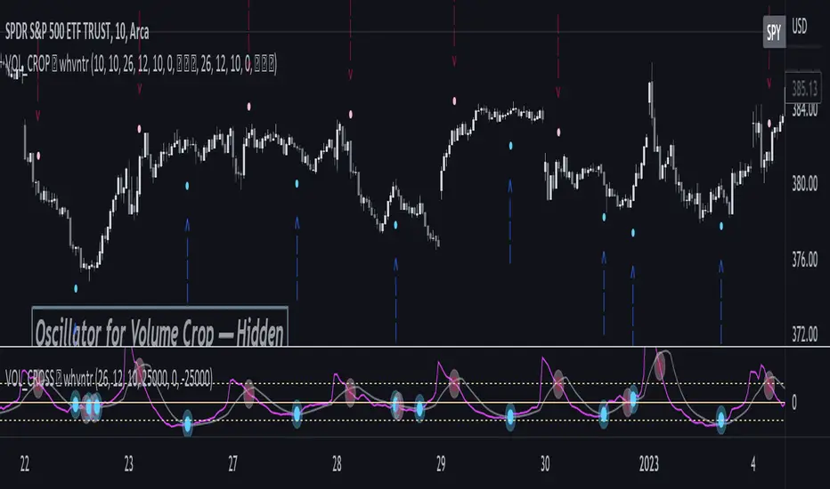 This fulfills a request from user: iTibu to make an oscillator to go along with one of my indicators named: "Volume Crop ━ Hidden Volume Divergence [whvntr]". It essentially does the same thing, without the Midline Tool, so you can better understand where the crosses are happening. Again, the hidden MACD Divergence circles formula originated from TheLark. I converted these values to volume instead of price.