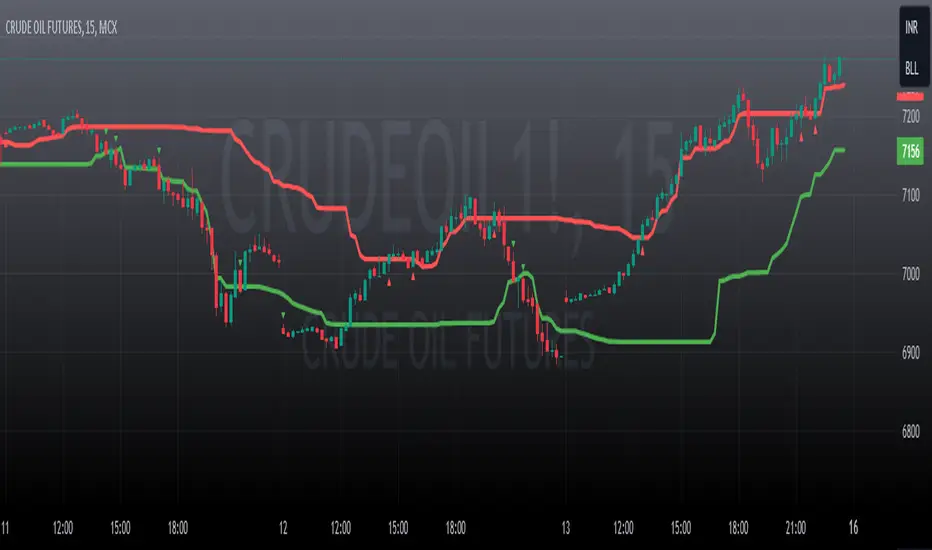 🚀 you could enter a long trade when the price crosses above both red and green lines plotted on the chart. (or when price crosses over both short stoploss and long stoploss.) You could also use the indicator to secure your profits by moving your stop-loss up as the price moves in your favor.
