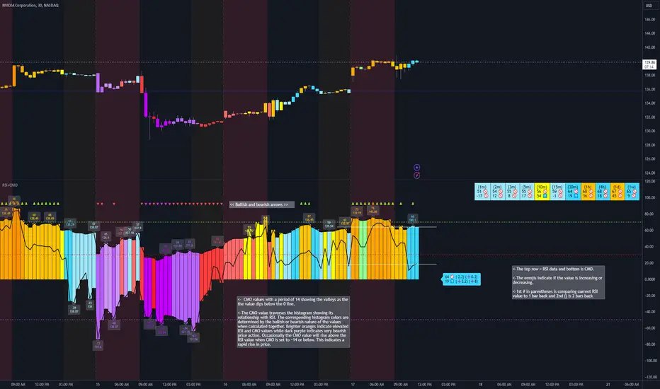 ➡️RSI/CMO Bullish and Bearish Signals: Colored arrow plot shapes (above the histogram) indicate when RSI and CMO values are signaling bullish or bearish conditions. For example, green arrows appear when RSI is above 65, while purple arrows show when RSI is below 30 and CMO is below -40, indicating strong bearish momentum.