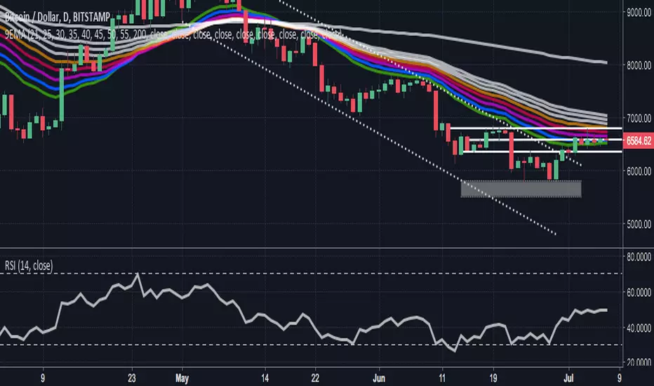 Using 9EMAs a ribbon pattern is created, in order to identify support and resistance points in forming trends, and possible reversal periods.