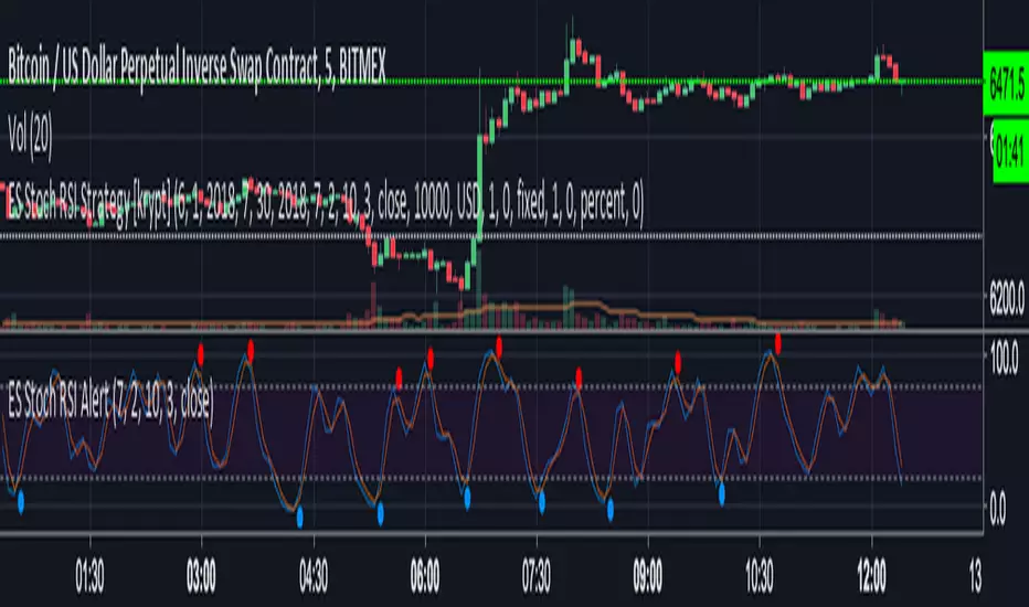 I have been asked by several people for a Strategy based on the ES Stoch RSI Alert so here it is. The strategy has an adjustable backtest date range so that you can adjust the test time period to whatever you like. This strategy is based on a script by fskrypt.