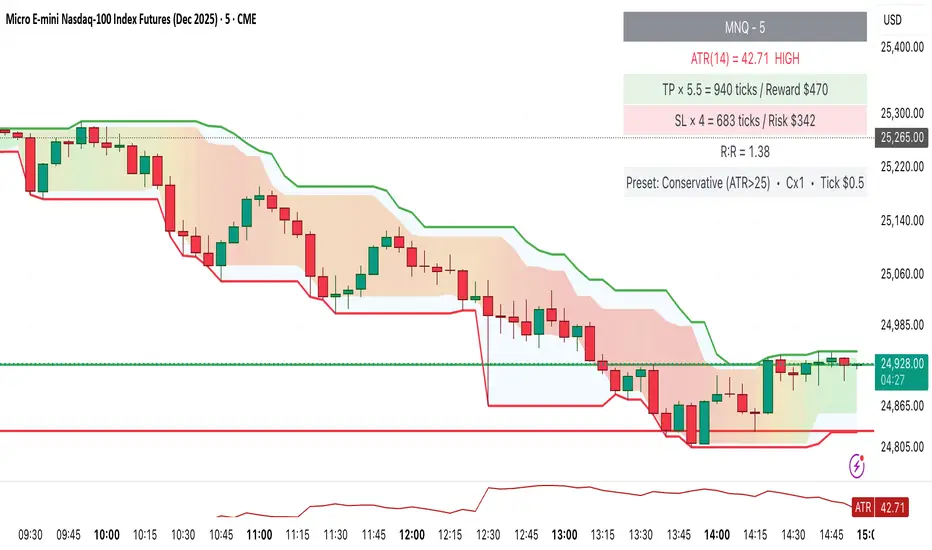 If ATR jumps above 25, it automatically warns you and, if conservative mode is on, switches to tighter settings (like TP × 5.5 / SL × 4.0).