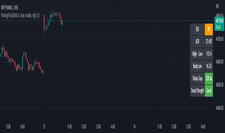 The Simple Floating Relative Index Strength Indicator to analysis the real time value of RSI along with High Minus Low of Day , Week and Monthly candle value and Real time Candle Body size. Simple indications of colors i.e. green indicates bullish and red indicates Bearish