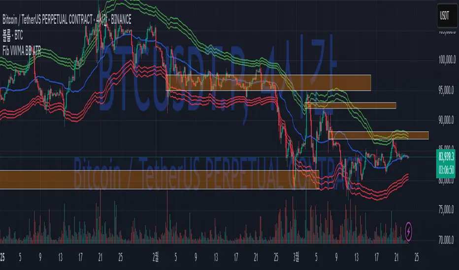 기존의 표준편차 기반 볼린저 밴드 대신, 피보나치 계수(2.618, 3.0, 3.414)를 ATR에 곱하여 밴드를 생성합니다.