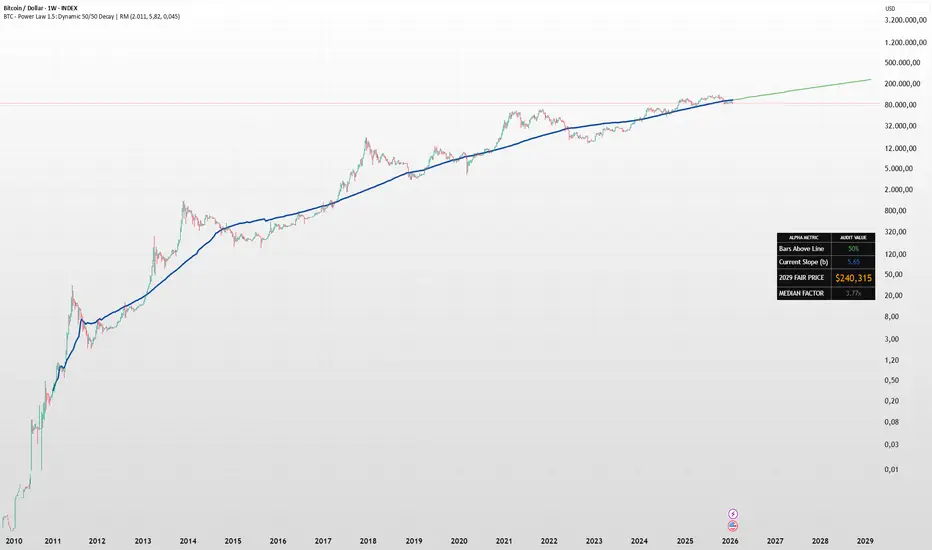 This script stands out by introducing a Maturation Framework. Instead of fitting to volatile extremes, we anchor the logic to a 50/50 Quantile Median, creating a backbone that is mathematically centered regardless of cyclical noise. By then applying a Dynamic Decay Factor to the growth exponent, we move away from the "static bands" approach and toward a model that respects the physical reality of a maturing, multi-trillion-dollar asset class. This provides a structurally grounded, institutional-grade view of Bitcoin’s trajectory that accounts for the diminishing returns inherent in global adoption.
