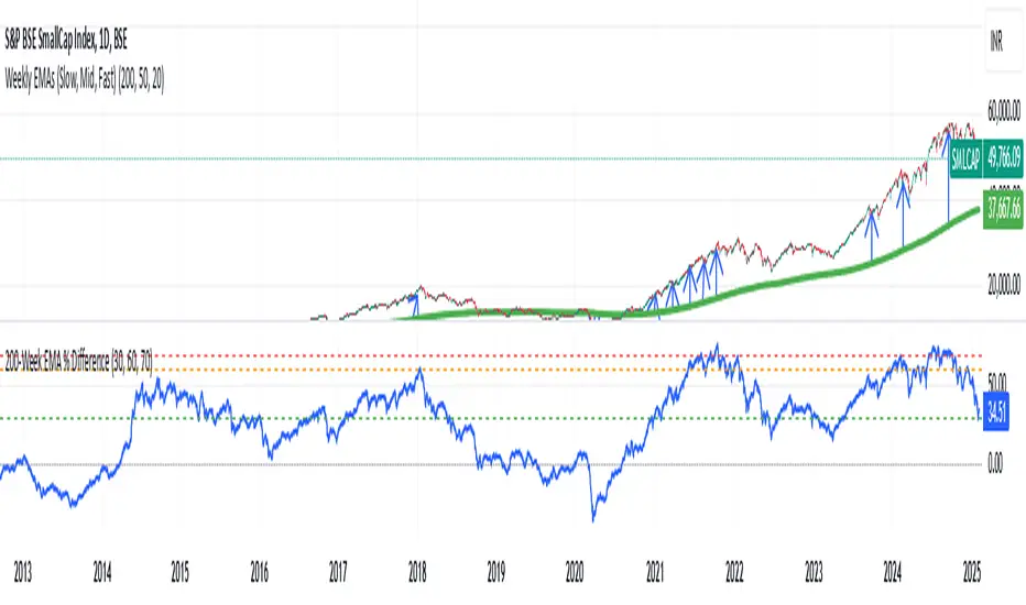 The 200-Week EMA Percentage Difference indicator measures how far the price of an asset or index has moved away from its 200-week Exponential Moving Average (EMA) in percentage terms. This provides a reliable gauge of whether the market is overstretched (overbought) or pulling back to support (oversold) relative to a long-term trend.