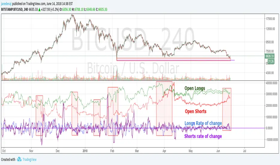Shows BTCUSDLONGS vs BTCUSDSHORTS along with their rate of change on a scale that's friendly for a combined indicator. ROC is increased proportionally so you can see it in relationship to Open Shorts and Open Longs on the same graph without zooming. I had been using an offset as well, but using an offset to adjust position causes the highs to look lower and it makes the lows look less low. It was significant enough to seem like a bad idea to include.