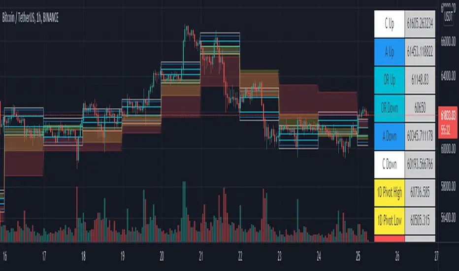 1) OR (Opening Range) is the range of the first bar of the day. In other words, it's just "high - low" of the first resolution (usually 15min.) bar of the day. So, OR lines (Aqua color) visualize this range for each trading session.