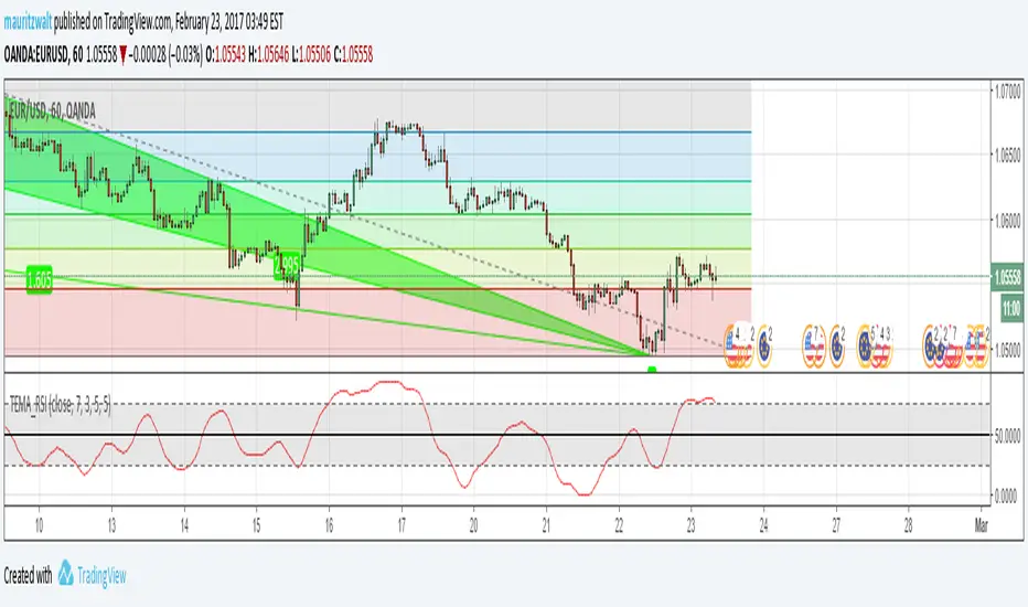 I use the RSI primarily for divergences and was in need for something more smooth to spot divergences easier without adding too much lag. Therefor I decided to use a Triple Exponential Moving Average (TEMA) to achieve this. /
