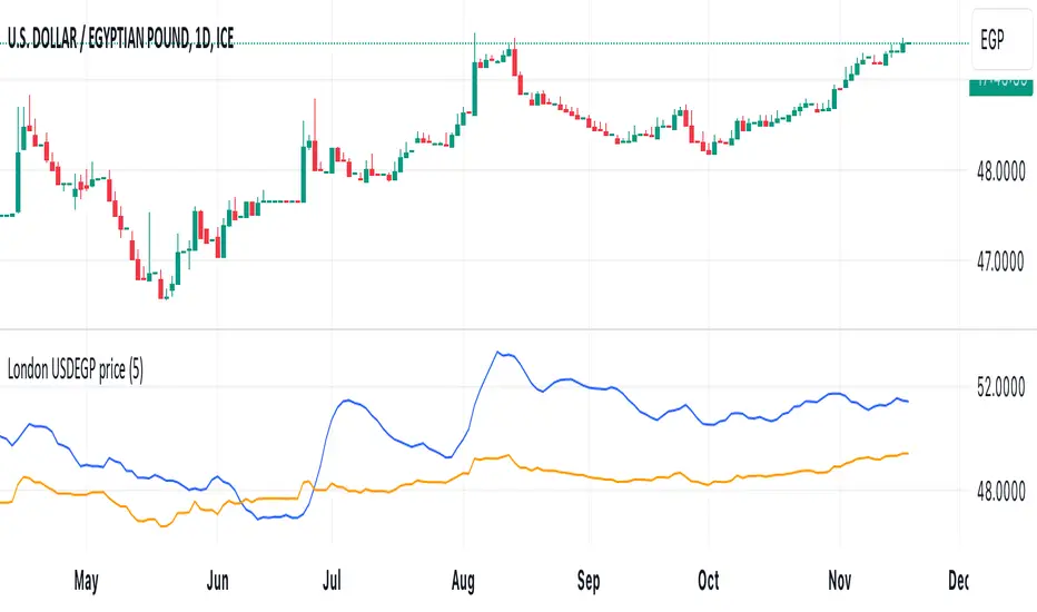 This indicator calculates the hypothetical USDEGP price using CIB receipts price in London Stock Exchange and its price in EGX. Values are smoothed.