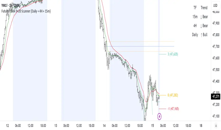 Futures EMA 9×20 Scanner (Daily + 4H + 15m)