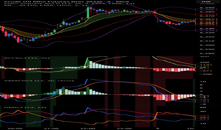 - **Elder Impulse**: Bar coloring system using volume-weighted MACD