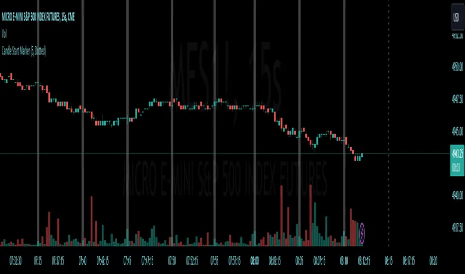 This indicator is ideal for low time frame traders and those employing multi-timeframe analysis. It helps in quickly identifying the start of new time intervals. For example I trade the 15 second timeframe and mark the start of every 5 minute candle.