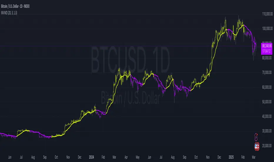 The Median Volume-Weighted Deviation is a technical trend following indicator that overlays dynamic bands on the price chart, centered around a Volume Weighted Average Price (VWAP). By incorporating volume-weighted standard deviation and its median, it identifies potential overbought and oversold conditions, generating buy and sell signals based on price interactions with the bands. The fill color between the bands visually reflects the current signal, enhancing market sentiment analysis.