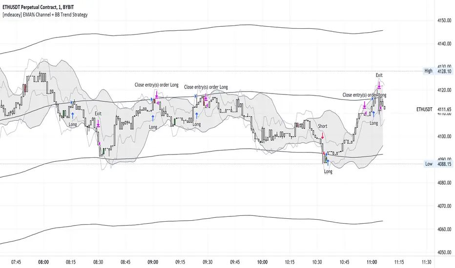 [mdeacey] EMA% Channel + Bollinger Band Trending Strategy