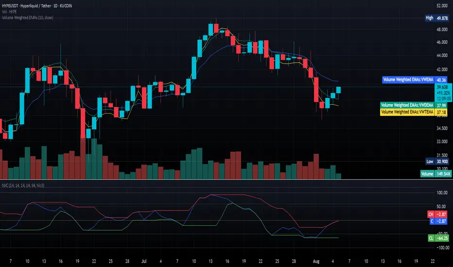 It's a script to calculate the volume weighted moving averages using exponential moving averages such as EMA, DEMA and TEMA instead of the pre-existing VWMA which uses SMA to calculate it.
