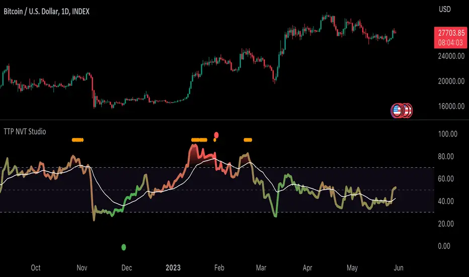 NVT Studio is an indicator that aims to find areas of reversal of the Bitcoin price based on the extreme areas of Network Value Transaction.