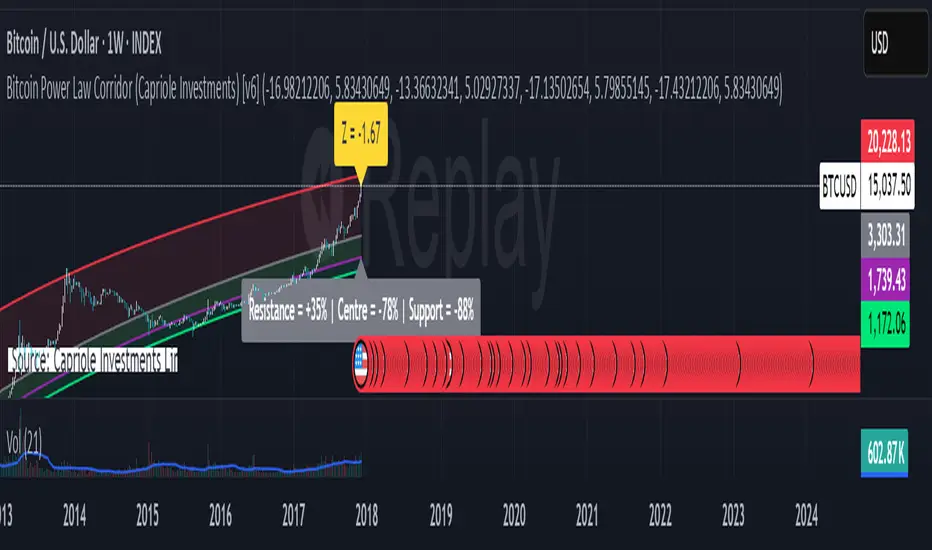 This script visualizes the long-term Bitcoin Power Law Corridor, a conceptual model originally discussed by Harold Christopher Burger, and enhances it with a logarithmic Z-Score framework.