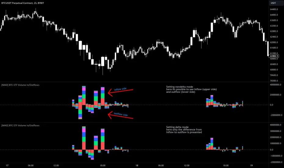 The " BTC ETF Volume In/Outflows" indicator is designed to analyze and visualize the volume data of various Bitcoin Exchange-Traded Funds (ETFs) across different exchanges. This indicator helps traders and analysts observe the inflows and outflows of trading volume in a structured and comparative manner.