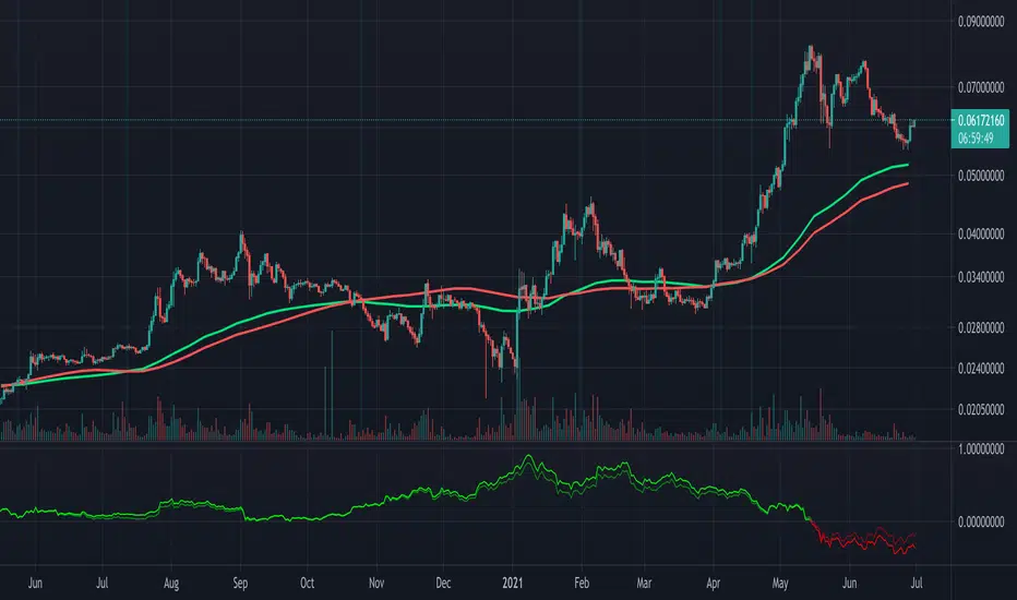 Plots the natural log of the price divided by the 20w SMA and 21w EMA , color coded by the Bitcoin price (green if above, red if below). Use this when comparing Altcoins to Bitcoin's performance. Works in daily & weekly timeframes only!Script de código aberto