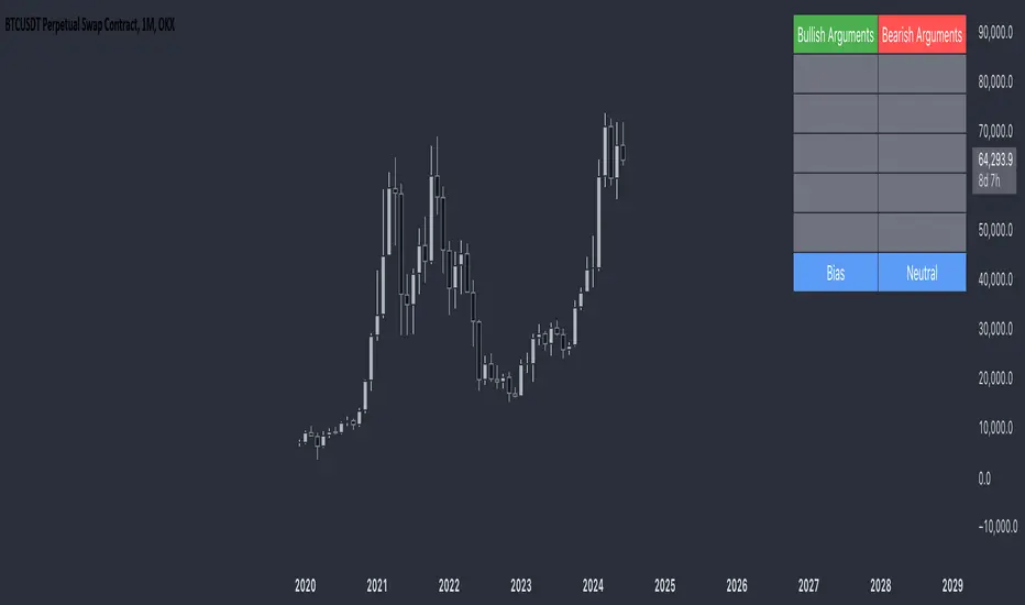 Bias Calculation: The script counts the number of non-empty bullish and bearish arguments and determines the overall bias. The bias is displayed in the table with a dynamically changing color to indicate whether the market sentiment is bullish, bearish, or neutral.