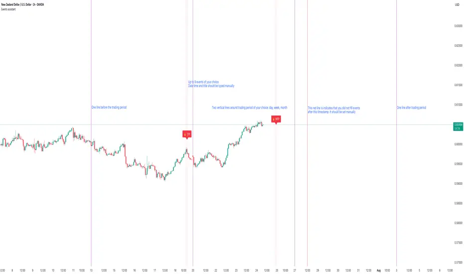 This indicator provides an ability to show events at chart. The events are typed manually, date and time is also selected manually. I use it to show news at chart: at the end of every month check the news calendar → select only important ones → add them to the indicator.Features included: