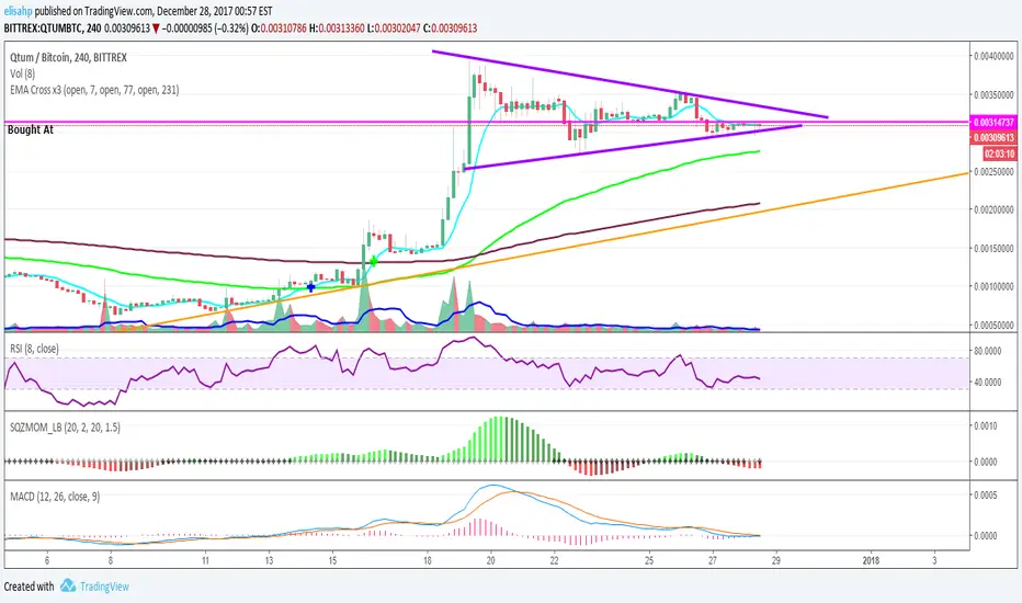 Exponential Moving Average at periods, 7, 77, 231. You will see a blue cross when the short EMA crosses the medium EMA, and a green cross when it crosses the long EMA.