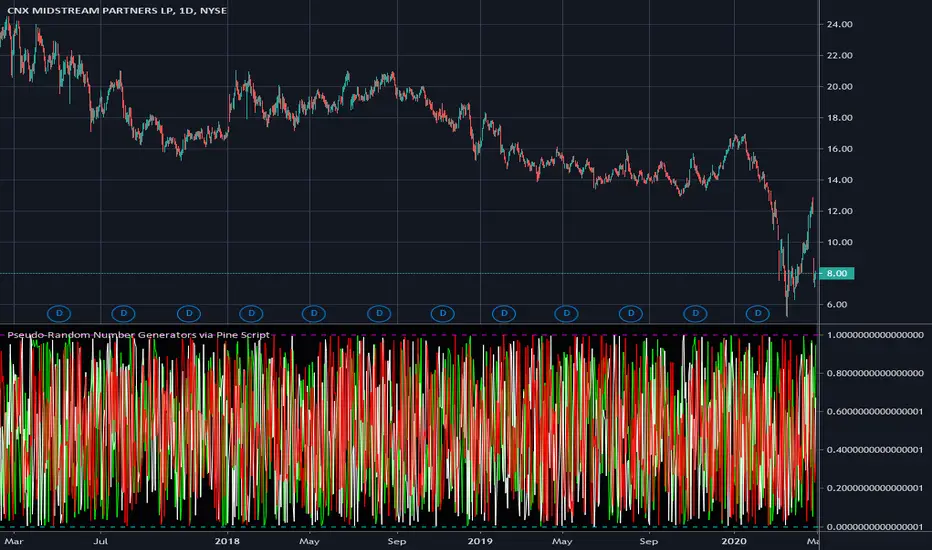 NOTICE: Use it as you please, this is free code to implement into your new Pine projects. You don't have to ask for my permission to reuse these functions in your published scripts, simply because I have better things to do than answer requests for the reuse of these simplistic PRNG functions. I don't require accreditation for members to reuse these functions either. I simply don't want any credit. I only require that you respectfully put it to "good and proper use" complimenting the elaborate script you have in mind. I would however like to see some great ideas utilizing these when I randomly and accidentally come across them in the public library. I didn't know where to put this script, so I just tossed it into the "Trend Analysis" category.