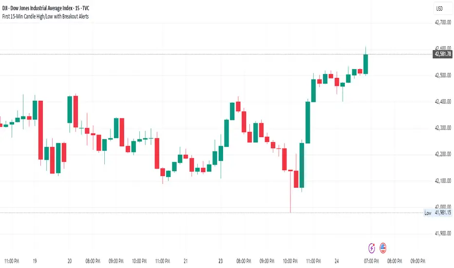 Description (for Publishing on TradingView):This Pine Script automatically plots the high and low of the first 15-minute candle of each trading day.