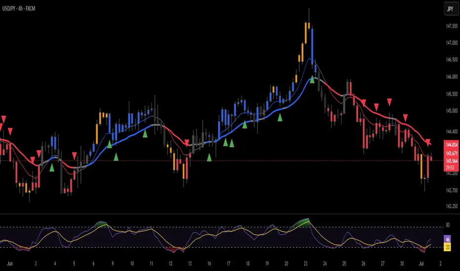 Once all trend criteria are met, a dynamic coloring system is activated to visually reinforce the trend across the candles and moving averages.