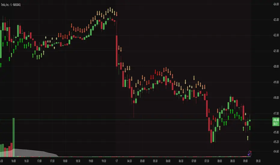 Adjust the weightings to emphasize the components that matter most to your style (e.g., more weight on CVD for scalpers, or ATR expansion for volatility traders). This update, from "Volume Pressure Arrows", which I felt was a slightly misleading title, to "Market Pressure Arrows" includes a self-optimizing mode users can choose to have on. When Optimize Mode is turned ON, the script enters a self-calibration process. It looks back over recent bars (by default a few hundred) and measures how strongly each component has correlated with forward price movement. Those correlations are then converted into weights that sum to 100%, giving the most influence to the inputs that have recently been the best predictors of direction or momentum. This weighting continuously adapts, in strong-trend markets you’ll usually see CVD and ATR expansion dominate, while in choppy or mean-reverting sessions VWAP and OBV slope often rise in importance. This effectively allows the indicator to teach itself what factors matter most in the current market regime. You can choose to have a table display which will show the current weightings as well. Self-optimization works in both replay mode and live charts since the calibration is performed based on the bars loaded in the chart, there is no look-ahead bias.