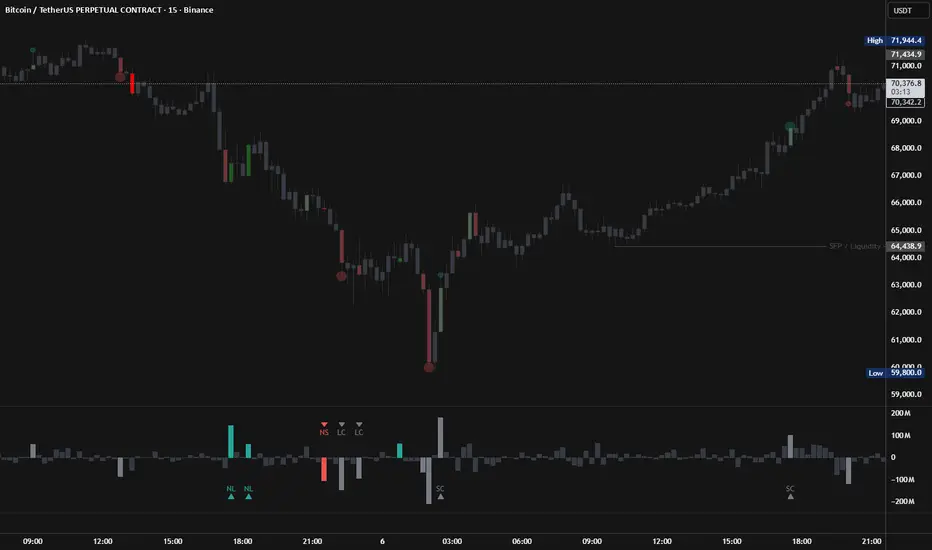 Works on any timeframe with OI data available. Most useful on 5m, 15m, and 1H for intraday crypto derivatives trading. The adaptive threshold auto-adjusts to your timeframe.