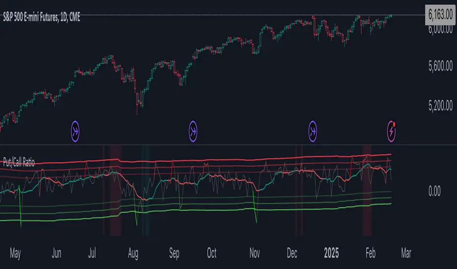 The indicator plots the Put/Call Ratio with adjustable moving averages and standard deviation bands to highlight overbought or oversold conditions. A short-term moving average (default: 10 periods) is displayed with trend-based coloring, while longer-term moving averages (defaults: 30 and 200 periods) are calculated but hidden by default. Bands at 1, 1.5, and 2 standard deviations provide context for extreme readings.