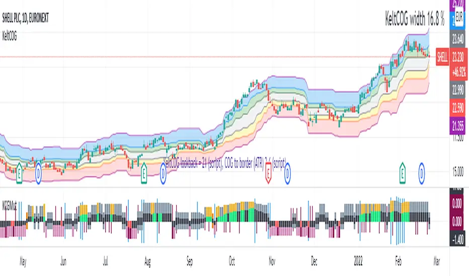 I tweeked the script of the KeltCOG (published) to calculate the columns and of REVE (also published) to calculate the volume spikes. Because the KeltCOG script had the default option to let the script chose lookback and adapt the width, I decided to not provide inputs to tweek lookback or channel width. Thus, if you use a KeltCOG in default setting, REVE and KCGmut together in the same chart, these will provide consistent complementary information about the candle. This layout has this combination: