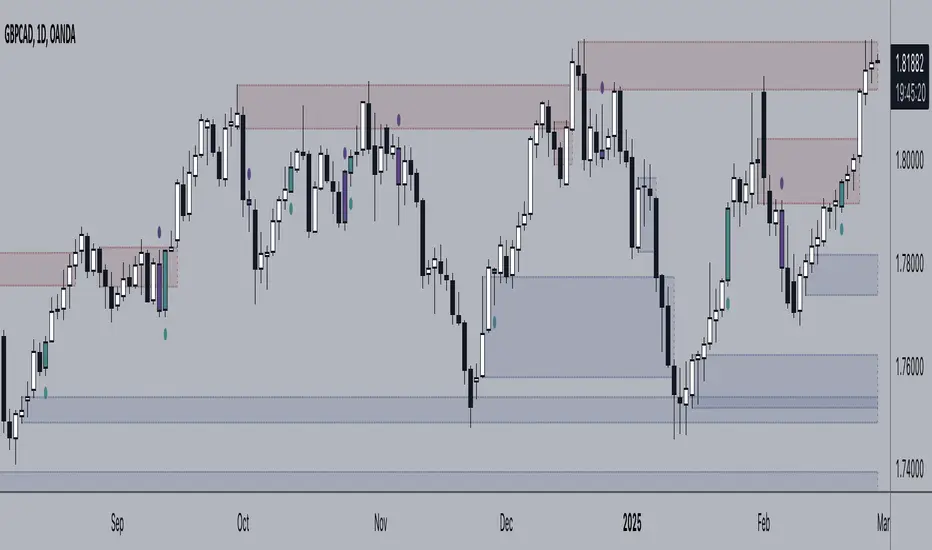 Visually, it is a simple, clean indicator. There are the zones, and then candle colors or shapes if you opt to add those. These zones are actually drawn from the candle preceding the cross over or cross under. Reason for that is often times the candle of the cross is fairly impulsive and exiting a consolidation. That period of consolidation is what is important to highlight, at least as far as I am concerned. The zones themselves extend until they are broken by a candle. A support zone stops at the candle that closes below its low. Vice versa for a resistance zone.